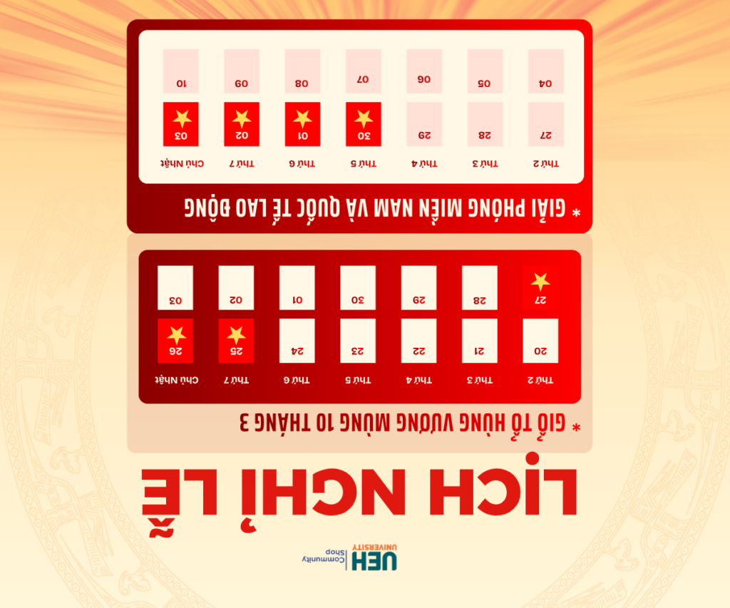 Nhằm đáp ứng nhu cầu của Quý khách hàng, UEH Community Shop trân trọng thông báo lịch hoạt động trước và sau dịp nghỉ Lễ Giỗ Tổ Hùng Vương (mùng 10/3 Âm lịch), Ngày Giải phóng miền Nam thống nhất đất nước (30/4/2026) và Quốc tế Lao động (01/5/2026), UEH Community Shop xin trân trọng thông báo đến Quý khách lịch hoạt động trước và sau kỳ nghỉ Lễ như sau: